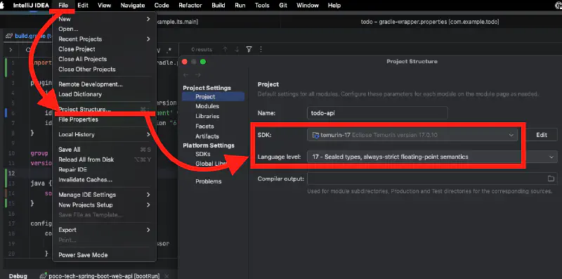 ビルドに Gradle を使用している場合は、build.gradle にプロジェクトで使用する JDK のバージョンが記述されています。 下記の手順で確認してください
